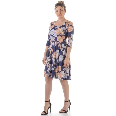 A sophisticated knee length dress that can be worn for casual or dressy occasions. Featuring a scoop neckline, three quarter sleeves, and a flattering pleated waist. Style this knee length fit and flare dress with flats for a cute day look or pair it with heels or a polished evening look. Made from a comfortable stretch polyester spandex blend material.