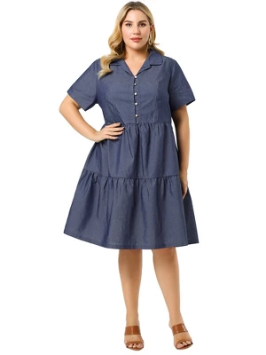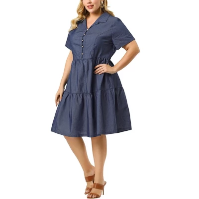 - The dress is in a regular fit with a turn-down collar, button front, elastic back, and midi-length denim dress