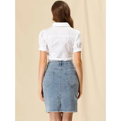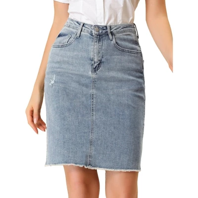 Treat yourself to the classic feel of this denim skirt with a raw hem, and washed details. With slim fit and pencil style details, this above-length skirt features classic four pockets, a frayed hem, comfy fabric, and a raw cut for your cuteness. Perfectly pair it with your simple dots t-shirt or sandals to complete your fashion look.