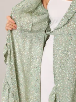 - V neck, one button front, ruffle trim, self-tie waist, wrap midi dress, button cuffs, short puff sleeves