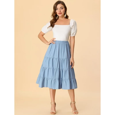 Slant pockets for effortless wear and an A-line tiered flare hem help to create an elegant and flowy look in spring or summer. In a midi length, this skirt with a fit-and-flare silhouette and an elastic waist exudes a carefree summer feel. This midi skirt features a ruffle hem and side pockets for a crisp finish to any look. Pair it with any sandals to create a variety of looks.
