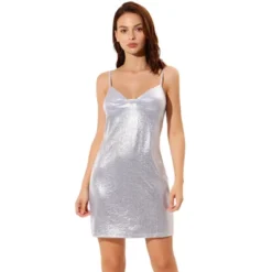 These adjustable spaghetti straps top this starting dress which is stunning. Features a v neck and spaghetti straps, this metallic dress channels fashion. The glitter will sparkle to make you more outstanding while dancing in the crowd. Perfect for birthdays, night out, club bars, cocktail parties, evening dates, daily life, casual wear, gathering, etc.