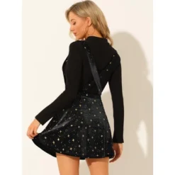 The star prints, and flare mini design are a great highlight, full of a sense of detail and design. Modern and fashion, this suspender skirt features softly velvet fabric and an elastic waist. Suitable for casual, holiday, party, holiday, nightclub and daily wear. This suspender skirt is easily paired with tops, heels and boots for a fashion and chic look.