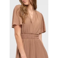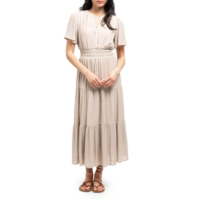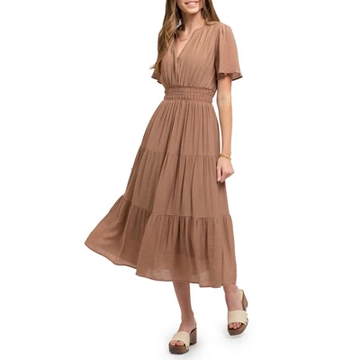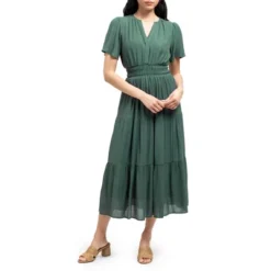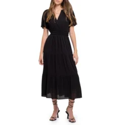 Introducing August Sky Women’s Tiered Midi Dress a mesmerizing dress that effortlessly combines elegance and comfort. The dress is adorned with flowy sheer short sleeves, gracefully draping from the shoulders, exuding a touch of ethereal charm. This lined dress features a stunning tiered skirt, adding depth and movement to your every step and the triple elasticized waistband enhances your silhouette while the ruched details between the elastic waistbands add a subtle flair. Crafted with meticulous attention to detail, this dress captivates with its exquisite design and ensures a delightful blend of style and ease. Step into this enchanting garment and embrace the allure of timeless beauty.