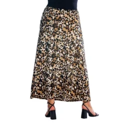 Easy fitElastic at back waist onlyHits below the kneeBack skirt length on size 18 is 28″Stretch knit jerseyContent: 95% Polyester / 5% SpandexCare: Machine wash cold gentle cycle with like colors. Only non-chlorine bleach when needed. Do not tumble dry. Lay flat to dry. Cool iron as needed.