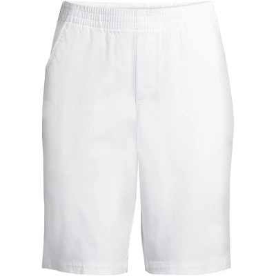 Our Landsâ End Womenâs Plus Size Mid Rise Elastic Waist Pull On 12â Chino Bermuda Shorts are the perfect example of stylish comfort. Cute comfortable stretchy and stylish you can wear these shorts from morning until night and never suffer an ounce of discomfort. Made from a quality cotton-blend with just a hint of stretch and a covered elastic waistband these pants offer that stretchy mobility you need to fit just right so they feel and look amazing. The breathable nature of cotton also keeps you cool and comfortable when you work or play indoors or outside. But the best part? They present like a dressy pair of shorts thanks to the Front hip pockets back welt pockets and neatly stitched faux zip fly. But donât worry they are still comfy enough to lounge in. Exactly what you want in a great pair of shorts right? Wear them with tunic tops dress blouse blazers suit jackets cardigan sweaters sleeveless shirts or a basic cotton tshirt or button-down shirt for a run to the store or a fun day around town. Add some sandals heels or slip-on boat shoes and youâll have a complete stylish outfit in minutes. Womenâs Plus Size Mid Rise Elastic Waist Pull On 12 Inch Chino Bermuda Shorts are available in a variety of colors and prints. Plus sizes start at size 16 plus petite plus size 16 and 18 available. Landsâ End adjusts measurement and proportions on plus size items to ensure the best fit possible. Consult the sizing chart for your true size fit.