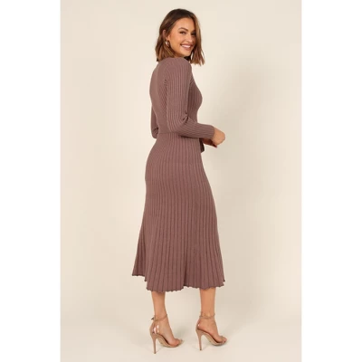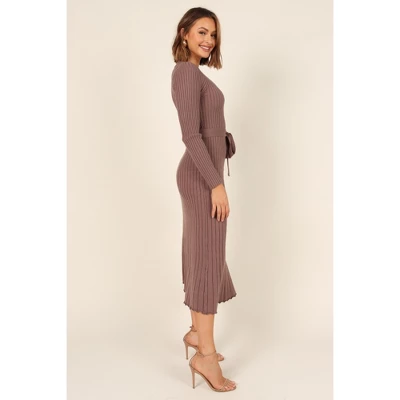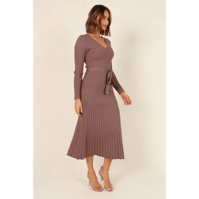 Look sophisticated and feel fabulous in this midi length knit dress. The v-neckline and long sleeves give it a classic look, while the detachable waist tie with belt loops adds an extra touch of elegance. Crafted from stretch ribbed knit, this dress features a flared A-line skirt design for a flattering fit.