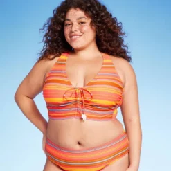 Ruched-front longline halter bikini top from Wild Fable⢠with shell-tipped drawstring fastening. Made from soft fabric with spandex and full lining for flexible comfort in and out of the water. Removable cups offer customizable coverage. Finished with behind-the-neck ties for a customizable, stay-put fit.