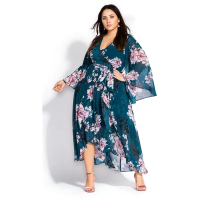 Meet your new wardrobe favorite! Dreamy and dramatic, the Jade Blossom maxi Dress boasts full length bell sleeves and a curve-loving wrap silhouette that will effortlessly fit & flatter your figure.Bold and fiercely fashionable, no one does plus size fashion like City Chic. Loved around the globe for its diverse range of fashion-forward styles for any occasion. From show-stopping evening gowns to workwear and casualwear, City Chic will take your style to bold new heights. Available in sizes 14-32.