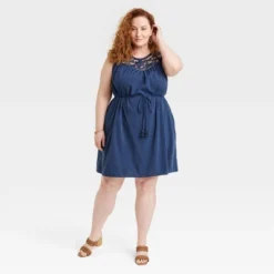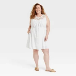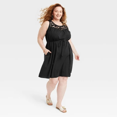 Add sleek style to your spring and summer wardrobe with this Wide Strap Sleeveless A-Line Dress from Knox Roseā¢. Fashioned in a solid color, it features an eyelet floral pattern on the neckline for a lovely look, while the button in back lends ease of wear. Featuring a tie closure at the waist for a flattering fit, this wide-strap blouse is crafted from cotton-blend fabric for comfy wear. Plus, the side pocket adds functional flair to your look.